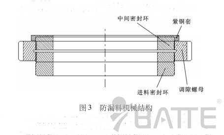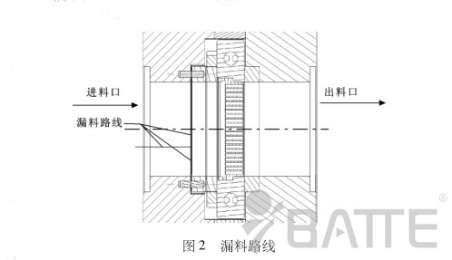 造成板式換網(wǎng)器密封處漏料原因:由圖1不難看出,在進(jìn)料密封環(huán)通過調(diào)隙螺母與滑板緊密配合的情況下,進(jìn)料密封銅環(huán)的另一端會(huì)和進(jìn)料口的底端面分離,即產(chǎn)生一定的間隙。在這種情況下,要想真正不漏料,只有進(jìn)料密封銅環(huán)的外徑和進(jìn)料密封銅環(huán)放置槽的配合精度很高才行。但事實(shí)上,在加工中,由于加工誤差的原因,這種高配合是很難做到的,這時(shí)就會(huì)出現(xiàn)如圖2所示的現(xiàn)象,會(huì)產(chǎn)生微小的相對(duì)配合間隙。由圖2不難看出,當(dāng)塑料溶液受到的壓力稍大時(shí)就會(huì)從產(chǎn)生的間隙中漏出來。