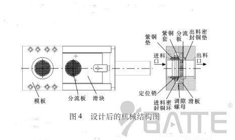 通過上述分析,可確認(rèn)塑料溶液是在壓力大的情況下從相互配合間隙中流出的。要解決這種漏料就要讓結(jié)構(gòu)更加完善,解決可能產(chǎn)生的間隙問題。對(duì)此情況進(jìn)行分析與設(shè)計(jì),所得機(jī)械結(jié)構(gòu)如圖3所示。