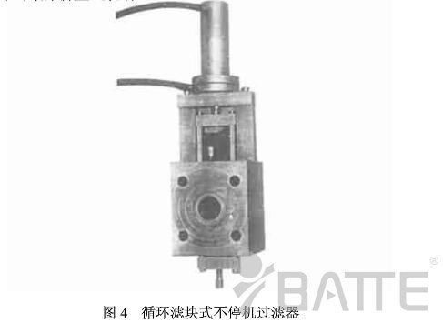新型熔體換網(wǎng)過濾器在國內(nèi)的開發(fā)應(yīng)用較晚,上世紀(jì)八十年代年國內(nèi)一些企業(yè)才研制出帶料壓傳感報(bào)警系統(tǒng)和高壓污料泄荷系統(tǒng)的循環(huán)濾塊式不停機(jī)換網(wǎng)過濾器(圖4),該機(jī)可在佳時(shí)機(jī)報(bào)警更換濾網(wǎng),使換網(wǎng)時(shí)機(jī)選擇可準(zhǔn)確量化,防止錯(cuò)換和漏換而且還能使主體總壓力比同類產(chǎn)品降低30%-50%,在美、德、日、奧、韓等國進(jìn)口的BOPP,CPE,EPE,塑料拉絲,彩印復(fù)膜生產(chǎn)線上配套使用證明安裝簡便,易操作,性能穩(wěn)定可靠。